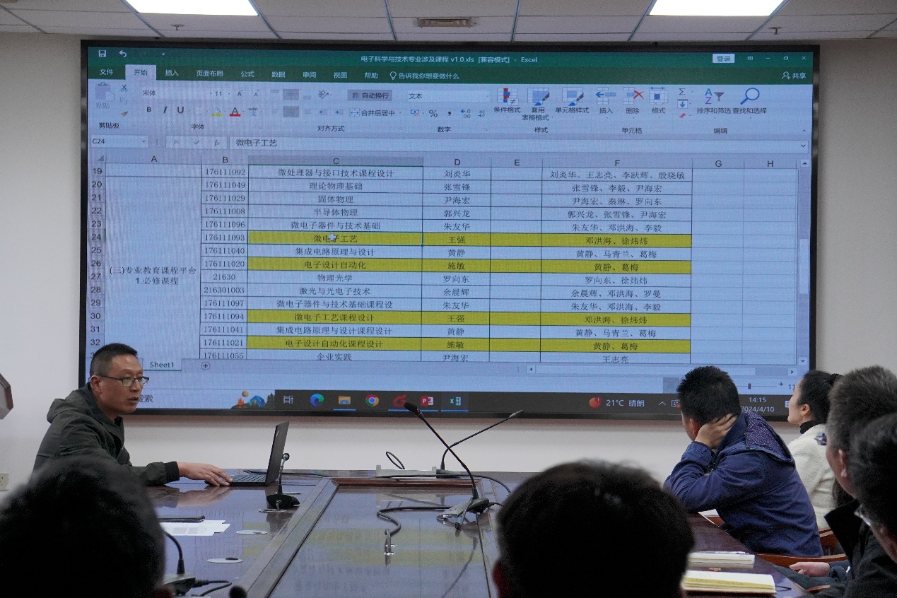微电子学系主任尹海宏老师围绕电子科学与技术专业、集成电路设计与集成系统专业的培养方案,就课程大纲、课程负责人、实验实践教学以及实习实训等环节作了简要汇报,与会人员积极参与,充分探讨,并形成了一致意见。