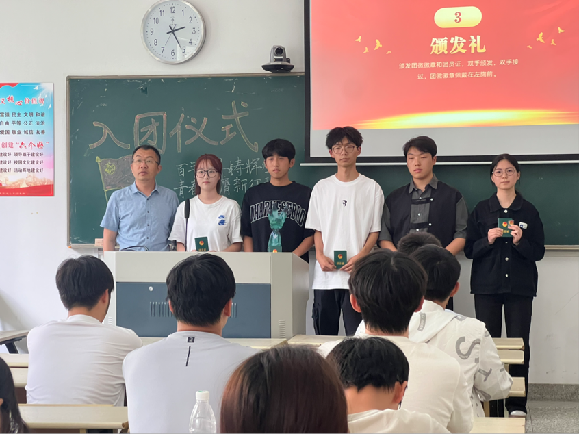 学院党总支副书记、副院长卢玉军为新入团的成员颁发团徽和团员证