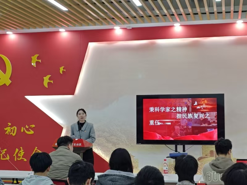 辅导员于蕴蕴以“秉科学家精神,担民族复兴重任”为主题,率先进行了宣讲。她结合个人经历,深刻阐述了科学家精神在新时代背景下的重要性和实践意义,她呼吁新时代的青年继承和发扬科学家精神,积极参与国家战略工程,致力于解决关键技术问题,推动国家的科技自立自强,为实现国家的繁荣富强和中华民族的伟大复兴贡献自己的力量。