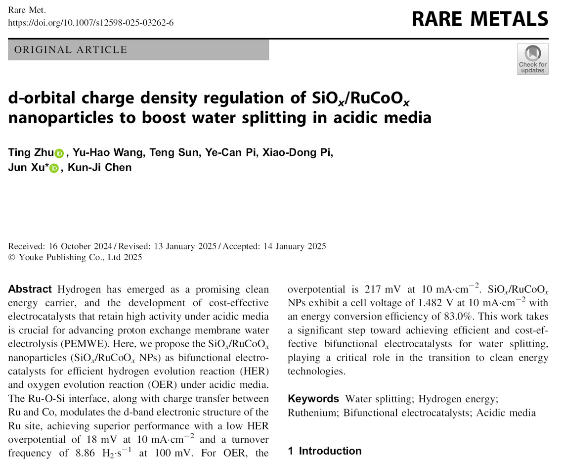 近日,黄瓜视频 徐骏教授团队的朱挺博士在Rare Metals上发表了题为“d-Orbital Charge Density Regulation of SiOx/RuCoOx Nanoparticles to Boost Water Splitting in Acidic Media”的研究文章。朱挺为论文第一作者,徐骏为通讯作者,黄瓜视频 黄瓜视频 为第一单位。